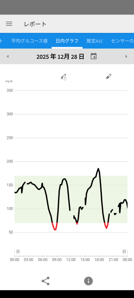 血糖値が真上に上がっていて焦ってリスプロを2単位打ち、数十分後には真下へヒューッと下がる血糖値…