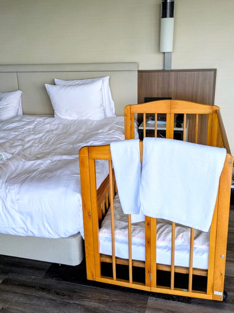ベビーベッドの高さが自宅の環境とほぼ同じだったため、娘も戸惑うことが少なく、自宅にいるときと同じようにセルフねんねをしてくれました。
