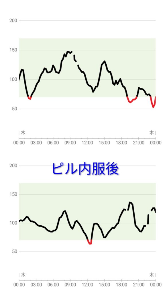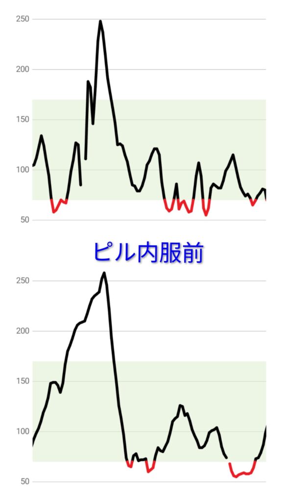 やっと下がったと思ったら、数時間後に一気に効いて低血糖…